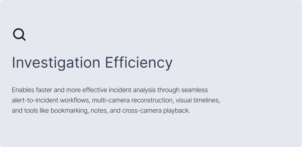 Designed to support efficient investigations, this workflow guides users from initial alerts to detailed incident analysis, bringing together key information and video evidence in a unified interface.